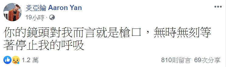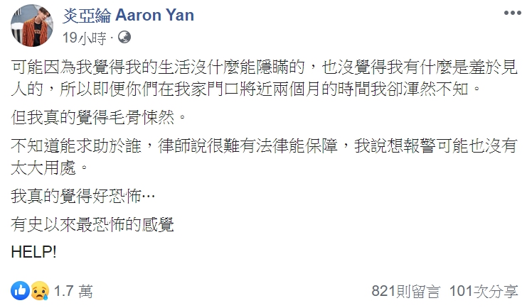 炎亞綸也指出,他認為他的生活其實沒什麼好隱瞞,也不覺得羞於見人,「所以即便你們在我家門口將近兩個月的時間,我卻渾然不知......,但我真的覺得毛骨悚然!」這些事情的發生,讓他不知道還能求助於誰,有問過律師,但對方也說難有法律保障,報警也沒有什麼用處,他最後語氣害怕地說,「我真的覺得好恐怖...有史以來最恐怖的感覺~HELP!」