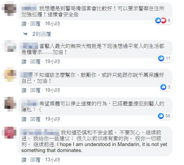 其他網友看到炎亞綸的貼文之後,都紛紛給予鼓勵幫他打氣,「不知該怎麼幫你,鼓勵你!或許只能跟你說千萬保護好自己,加油!」、「辛苦了!無時無刻被監視的感覺好可怕,要多注意自身安全,加油」、「過好你的生活,保護好自己!」,還有網友建議,「感覺得出來你真的很氣...能不能走其他出入口?能躲嗎?」炎亞綸後來也回覆網友說,「我不氣,我是害怕!」此外,炎亞綸的私生活曝光在中國也引起了關注,他也在微博發文說,「我哭了...看到自己為了環保如此盡心盡力,我被我自己感動哭了!」