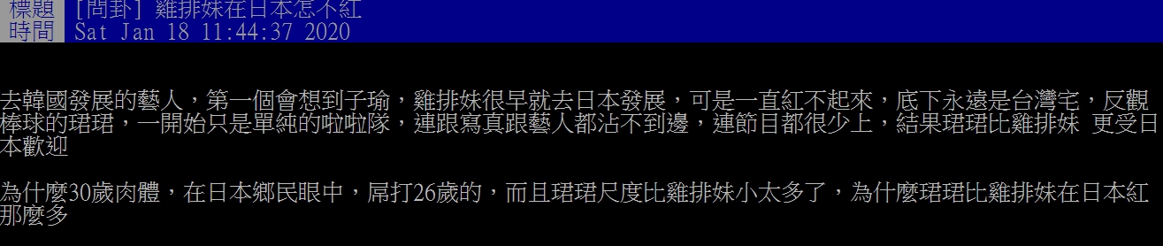 日前有鄉民在PTT發文詢問,為甚麼雞排妹在日本紅不起來?內文中該網友提到,雞排妹很早就到日本發展,卻一直紅不起來,永遠只有台灣人自挺而已。他也舉出例子比較表示,中信兄弟啦啦隊的峮峮,原本只是單純的啦啦隊員,連寫真藝人都不算,節目也鮮少有她的蹤影,甚至年紀還比雞排妹大,結果峮峮卻在日本更受歡迎,因此便在PTT上詢問廣大鄉民,「為什麼珺珺比雞排妹在日本紅那麼多」?