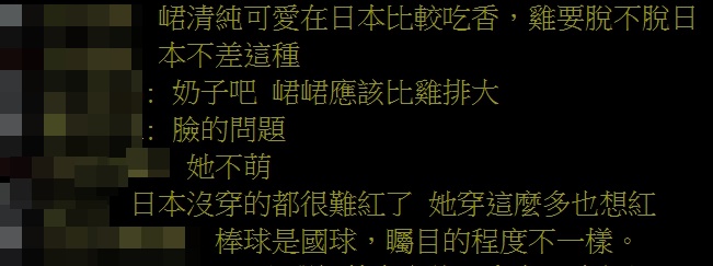 問卦文章一出,立刻有不少鄉民湧入討論,紛紛留下自己的看法表示,「峮峮清純可愛在日本比較吃香」、「棒球是國球,矚目的程度不一樣」、「日本不缺賣肉的」、「雞排妹臉是好看,但不夠可愛也不夠冷艷」、「日本民族性很強,要紅輪不到外地人」。不過也有不少人聲援雞排妹,認為日本的市場很大,海外藝人很難界定紅還是不紅。