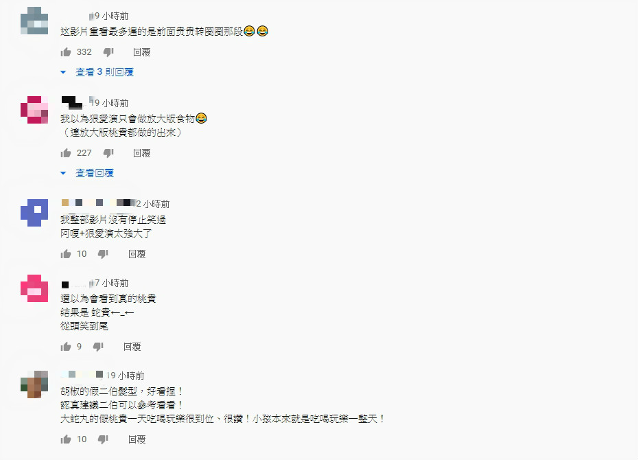 影片「笑」果十足獲得網友一致好評,紛紛湧入影片底下留言,有網友表示「我以為狠愛演只會做放大版食物,連放大版桃貴都做的出來」、「這影片重看最多遍的是前面貴貴轉圈圈那段」、「我整部影片沒有停止笑過,阿嘎+狠愛演太強大了」、「還以為會看到真的桃貴,結果是『蛇貴』,從頭笑到尾」、「寶寶粥~Shot起來」