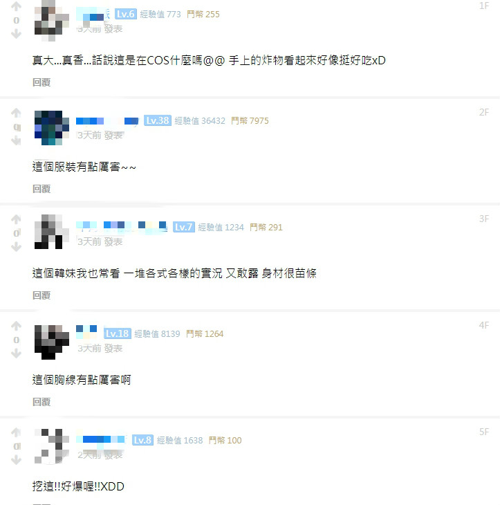 這段直播片段被網友瘋狂分享,更有網友將它上傳遊戲論壇,發文表示「韓妹這個衣服你承受得住嗎?」,再掀網友熱烈討論,有網友在貼文底下留言「這個服裝有點厲害~」、「挖這!好爆喔!」、「這個胸線有點厲害啊」、「真大真香……話說這是在COS什麼嗎,手上的炸物看起來好像挺好吃」,同時也有網友認出這位美女實況主「我也常看,一堆各式各樣的實況,又敢露、身材很苗條」