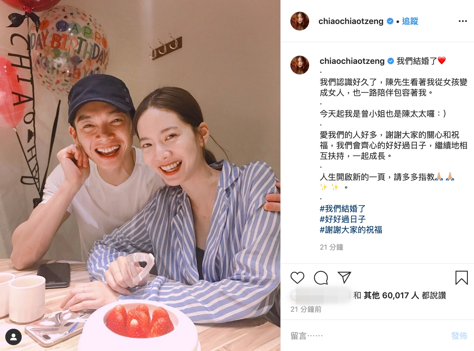 小年夜報喜訊!藝人曾之喬今(23)天於IG上宣布結婚消息,而老公就是情傳9年的緋聞對象「辰亦儒」,。曾之喬在IG上提到,兩人認識已久,對方看著她從女孩變成女人,一路陪伴著,因此從今天開始起,她是曾小姐也是陳太太!同時曾之喬也貼出兩人對著鏡頭燦笑的照片,甜到不行,讓網友紛紛留言直呼「恭喜」!