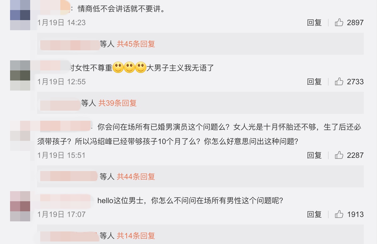 而鄭愷調侃鄭麗穎的影片流出後,立刻引起廣大網友討論,紛紛留言表示「那個問題怎麼不問男演員?」、「女性在職場上取得的成功,最後連掌聲都要送給老公,真棒」、「誰看了都尷尬」、「男的帶孩子就很偉大嗎」、「為什麽這種問題被問的都是女明星,結婚生子也不是一個人的事」、「憑什麼女生就應該在家帶孩子呢?有給在家帶孩子的女性鼓掌嗎」。