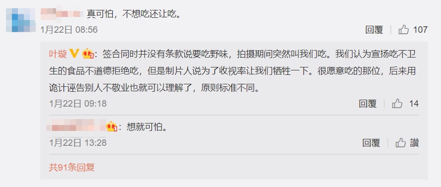 時隔四年多,葉璇才在微博上說出節目當時的內幕,更在留言區加碼爆料當初簽合約時沒有條款提到要吃野味,是拍攝期間突然的要求,大部分藝人認為在節目上吃野味有宣揚意味因此拒絕,卻被製片人要求他們「為了收視率犧牲」,讓她相當憤怒,更直言「對好團隊好導演好作品,咱心甘情願賣命。對唯利是圖、是非顛倒的團隊,寧願不掙他們的錢!」