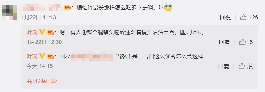 女星「葉璇」近日在微博上發文呼籲拒絕吃野味,她透露:「想起有個製片人叫我們鏡頭前吃來歷不明的竹鼠、蝙蝠,有些演員拒絕吃,願意吃的演員就跟節目組欺負我們,還對外說我們不敬業耍大牌。」引起網友熱議,有網友在留言區驚呼「蝙蝠竹鼠長那樣怎麼吃得下去啊」,葉璇也爆料當時「有人能整個蝙蝠頭嚼碎還對著鏡頭沾沾自喜,匪夷所思。」