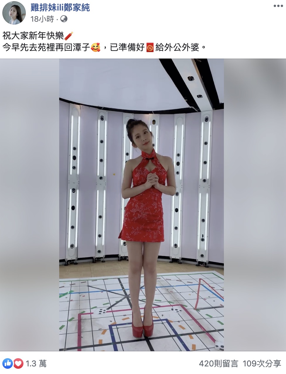 雞排妹在除夕(24)發出則拜年的影片,畫面中她穿著一件大紅色的改良旗袍,胸前區域呈現挖空的設計,展露出深邃的事業線以及傲人的雙峰,而該件旗袍也並非一般傳統至腳踝的長度,而是改為在大腿根的長度,露出了一雙纖細白皙的美腿,而雞排妹也雙手合十祝賀大家新年快樂,除了發出影片之外她也配上文字:「祝大家新年快樂。今早先去苑裡再回潭子,已準備好(紅包)給外公外婆」,可謂誠意滿點。