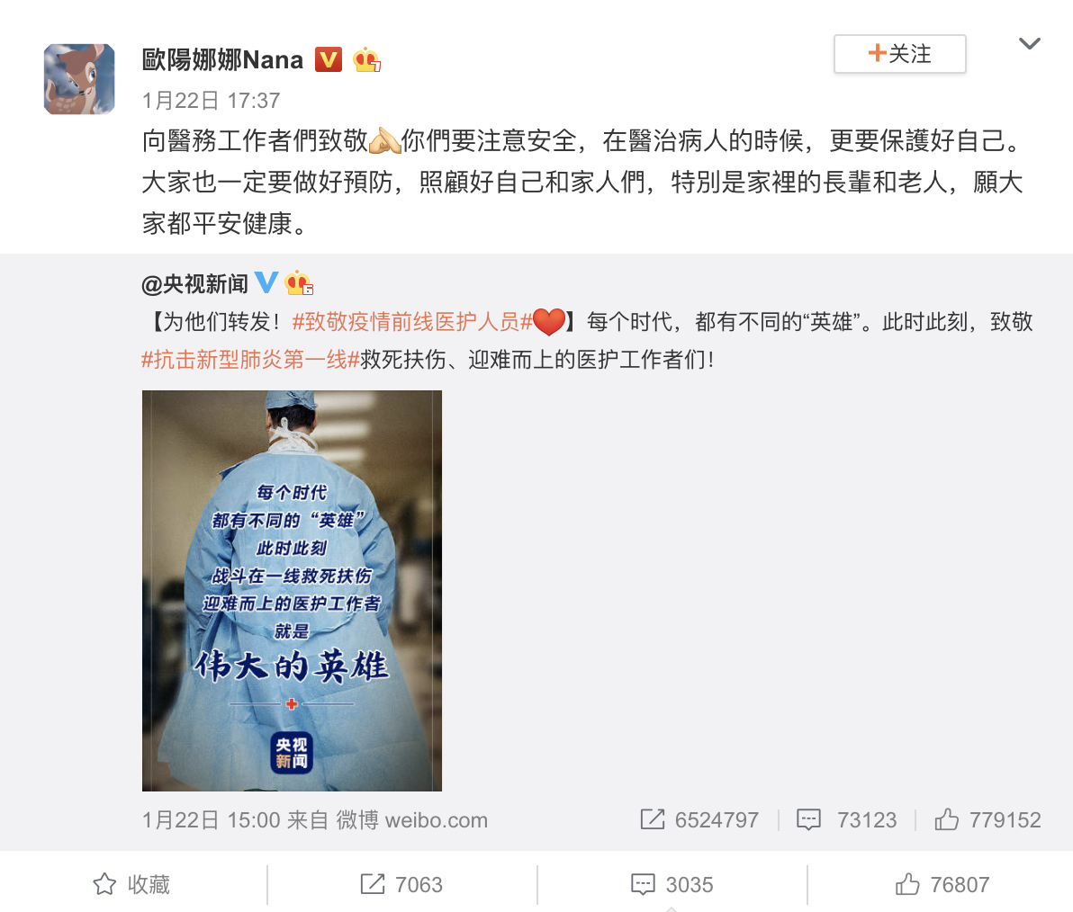 中國最近爆發的「武漢肺炎」,已經嚴重到全世界都在關注這件事情,而歐陽娜娜22日也在微博轉發央視新聞「致敬前線醫護人員」的新聞,還在貼文中寫道,「跟醫務工作者們致敬,你們要注意安全!在醫治病人的時候,要保護好自己~大家也一定要做好預防,照顧好自己跟家人們,特別是家裡的長輩跟老人,願大家都平安健康!」好意轉發分享,希望網友們看到之後,都可以更加注意家中長輩們的身體狀況!