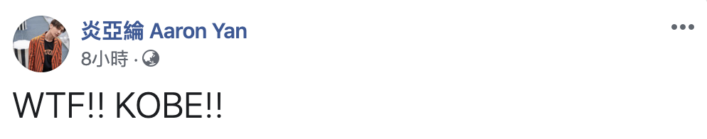 Kobe曾在2016年時,為了活動來台,當時跑了台北跟高雄兩個地方,吸引了超多粉絲跟藝人們前往朝聖,其中藝人炎亞綸也是Kobe的忠實粉絲,他在得知自己心愛的偶像離世以後,一連發了3個貼文,表示自己完全無法相信心愛的偶像已經離開了人世間,並且還貼出他跟Kobe的合照來哀悼,他在貼文中寫下,「凌晨,哭的滿臉淚滿臉鼻涕......我不知道能說什麼。只能說謝謝你...謝謝你教會我不放棄,教會我努力!你走了可是你的精神會永遠留下。對不起你得那麼痛的離開......老天啊...為什麼?」讓人感受到滿滿的不捨。