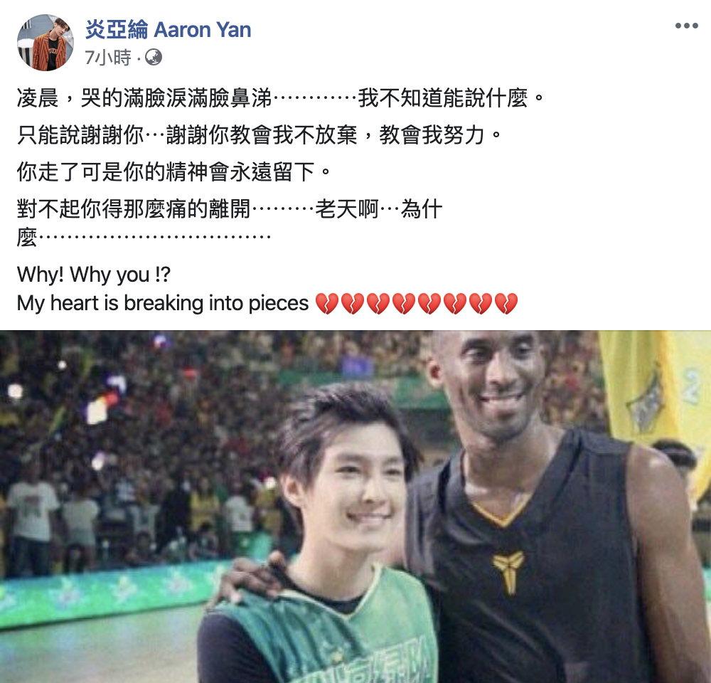 NBA球星柯比布萊恩(Kobe Bryant)驚傳空難身亡,他原本搭乘私人直升機打算要去訓練,沒想到飛到一半直升機竟意外在加州洛杉磯卡拉巴斯薩墜毀!機上9位乘客全數喪命,其中也包含了柯比的女兒,讓各界都震驚不已,完全無法接受傳奇球星突然這樣離開了人世間!不少藝人們也都紛紛在自己的社群平台上發文哀悼,其中炎亞綸更是一連發了三篇貼文,讓網友們都感受到他有多麽的悲痛!