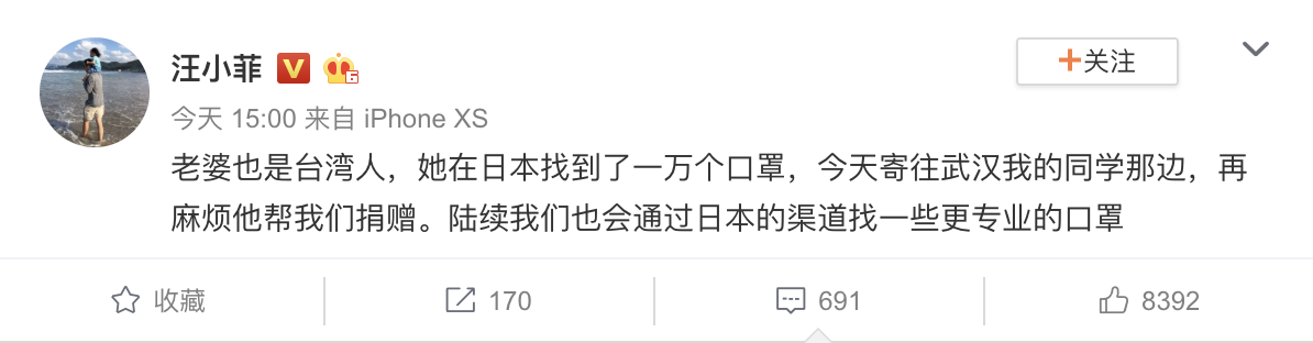 藝人大S的老公汪小菲因為得知目前在中國「武漢肺炎」的疫情越發嚴重,而且越來越不受控制,非常擔心人民們的安危,便於27日在微博發文表示,「老婆也是台灣人,她在日本找到了一萬個口罩,今天會寄到武漢我同學那邊,再麻煩他們幫忙捐贈!陸續我們也會透過日本的管道,找一些更加專業的口罩。」讓大家感受到滿滿的溫情!