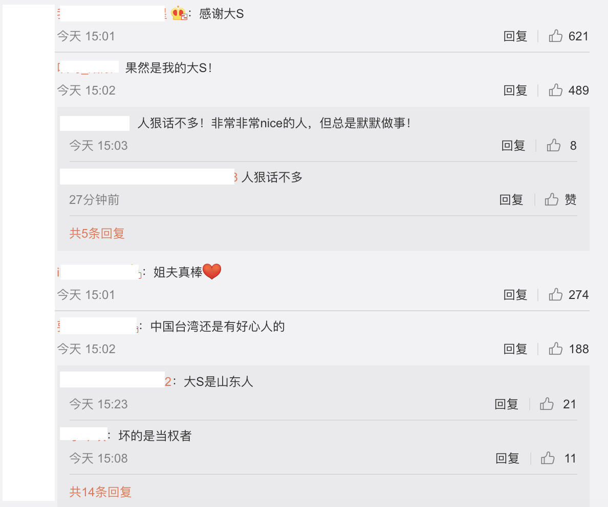 網友們看到汪小菲在微博的發文之後,都紛紛留言表示,「人狠話不多,但是是非常好的人,總是默默做善事!」、「中國台灣還是有好心人的!」、「大S是山東人好嗎~」、「謝謝大S!人美心也美」、「雖然非常討厭台灣,但是大部分的台灣人都是很有善意的!」、「最棒的夫妻檔!」、「希望可以直接捐贈到需要的醫院!」、「謝謝每一個幫助我們的人」、「當權者不是說不給中國口罩嗎?」、「哇!汪大哥真的是娶了好老婆啊!」。