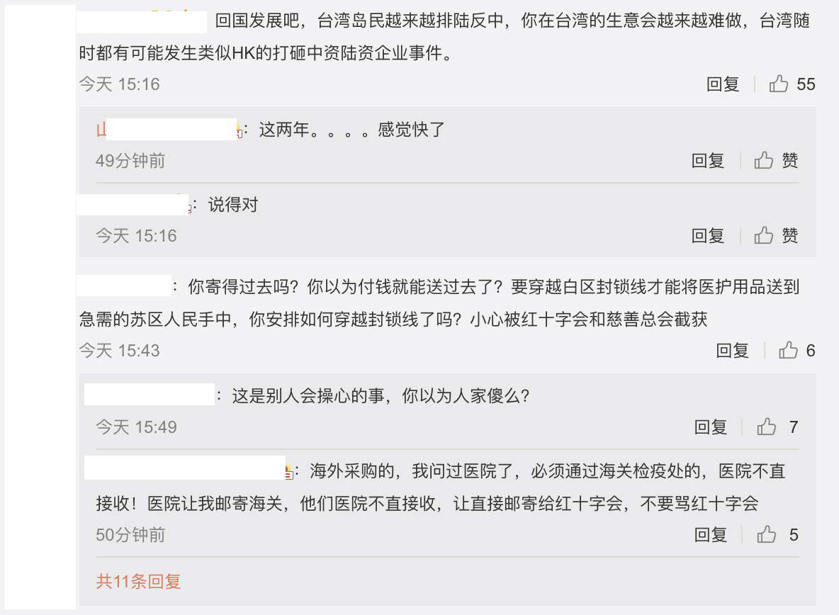 此外,也有不少中國網友對於台灣政府不願出口口罩到大陸,有著非常不滿的情緒,不過根據《中時》報導,蘇貞昌表示,「之所以會禁止出口一個月,是因應武漢肺炎疫情加重,台灣必須要有充足的準備,才不會到時候連台灣人也沒口罩可以戴,而先前中國隱匿疫情,還不讓台灣參加WHO,不讓台灣跟世界各國一起防疫,實在遺憾也不對,防疫沒有國界,也因為這次的動作,反而讓人看到中國不理性的一面。」