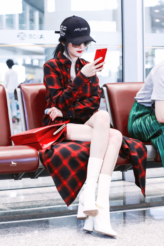 不過引起網友注意的,還是楊冪的衣著。楊冪雖然穿著一件長版的黑紅格子罩衫,不過內搭卻相當簡單性感,上半身穿了一件黑色的上衣,雖然造型簡單,不過卻讓她露出大片胸前肌膚,衣服設計也相當「顯胸」,讓「大冪冪」一覽無遺。下半身楊冪則搭了一件熱褲,露出一雙筆直的「筷子腿」,在白色長靴的襯托下,顯得更加修長。尤其當她翹腿坐在椅子上時,更顯得美腿既修長又白皙。