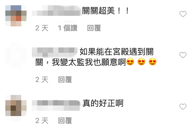 關關照片一出,瞬間引來不少網友,紛紛大力稱讚並留言表示,「太美了!」、「風騷美豔刺客」、「這眼睛會發電」、「女帝關」、「如果能在宮殿遇到關關,我變太監也願意啊」、「請納我為後宮、「老話一句:關關好正」、「妳的後宮還缺人嗎?」。