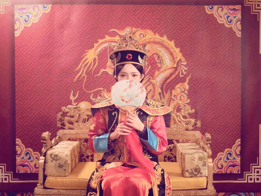 網紅「關關」是YouTube頻道「上班不要看」的成員之一,被網友封為「上班不要看女神」,有著水汪汪的大眼,再加上一雙修長美腿,擄獲不少粉絲的心!因關關有鏡頭恐懼症,所以總是戴著黑色口罩示人,適逢農曆新年,關關也在IG上傳「清宮照」拜年,改以扇子遮臉,女帝裝扮瞬間美翻眾人!