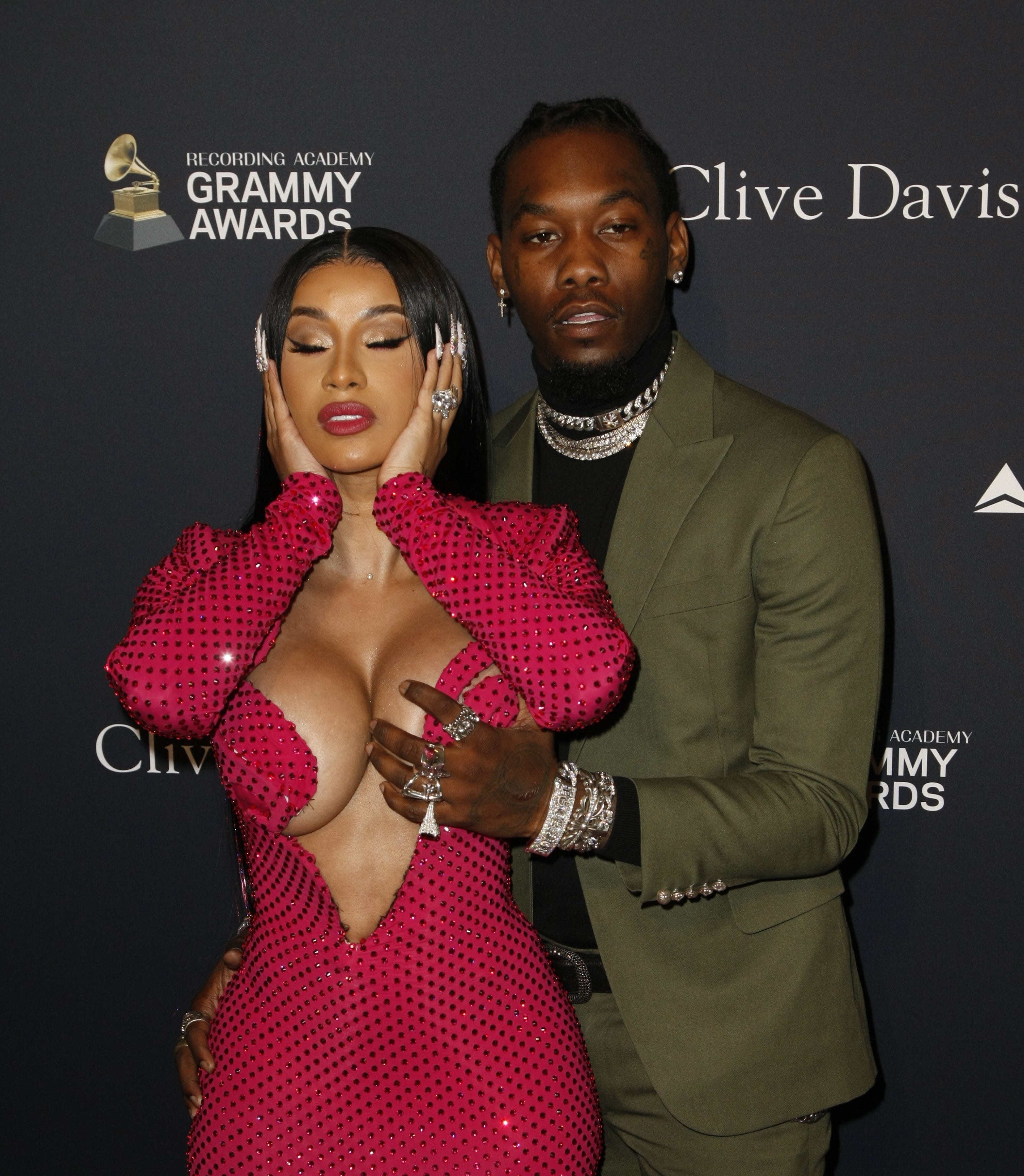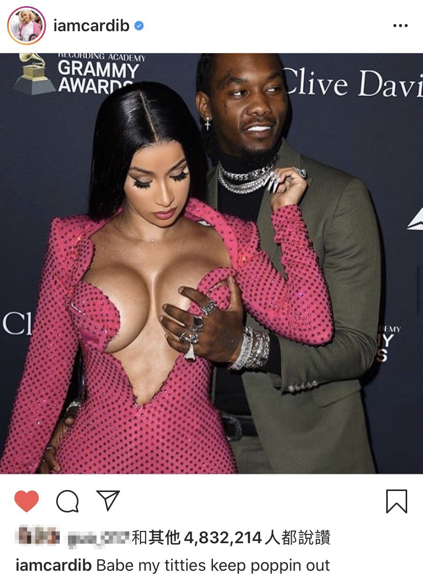 眼見老婆即將要走光,老公Offset也立刻出手救援,先走上前貼心的替卡蒂B拉好胸前的布料。不過隨後在拍照的時候,卡蒂B一舉起手,衣服就又被撐開,Offset只好立即伸出左手捧住老婆的左胸,在鎂光燈前勇敢的「喬奶」遮點,畫面被諸多攝影師捕捉下來,就連卡蒂B本人也上傳了老公捧胸的照片,留下了:「寶貝,我的胸部一直跑出來。」一行話,似乎是相當滿意老公的表現,粉絲看到該張照片後也不禁大讚Offset的行為。