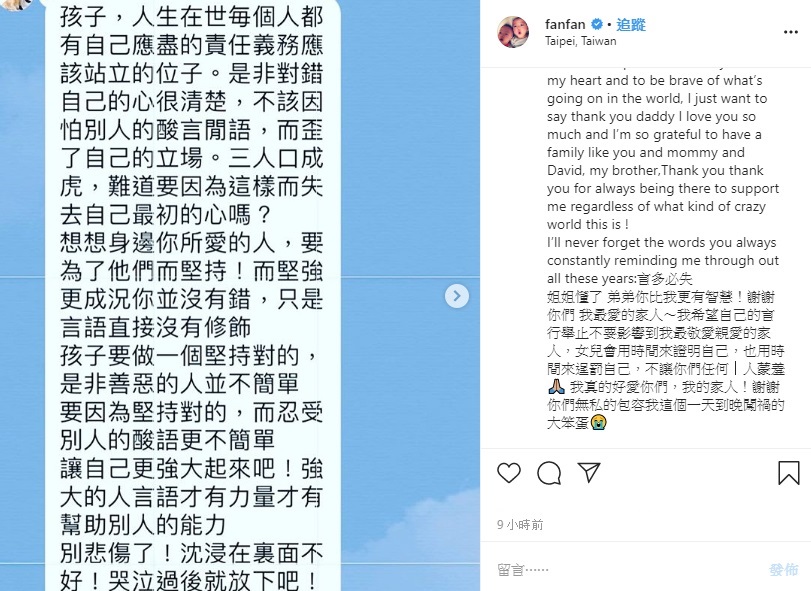藝人范瑋琪因「台灣禁止出口口罩」一事,在私人臉書飆罵蘇貞昌是狗官,引起網路上一片撻伐,而她30日再次在臉書跟IG同步發文表示,「謝謝爸爸、媽媽,女兒會努力做好,學會當一個人溺己溺,有同理心去愛、去關心身邊的人!」並說「會用時間來證明自己,也用時間來懲罰自己,不讓任何家人蒙羞!」沒想到網友們看完沒有消氣,反而更猛烈的開砲,讓她回說,「我全家暴斃你最開心,對嗎?」