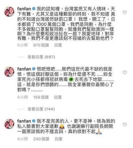 不過其他網友看到她的新貼文,依然不肯放過她的繼續猛烈留言,「演完了沒啦~過氣仔!」、「幹話說完發脾氣」、「提油的腦公怎麼沒來救火」、「Good luck搞清楚狀況再發文」、「經過一個晚上希望您真心的了解整件事情」、「可悲~趕快去中國當義工」、「在留言道歉然後刪文~真有你的」、「你去對岸發口罩,做善事,心情會比較好喔~趕緊去!」、「回哈佛睡吧」。