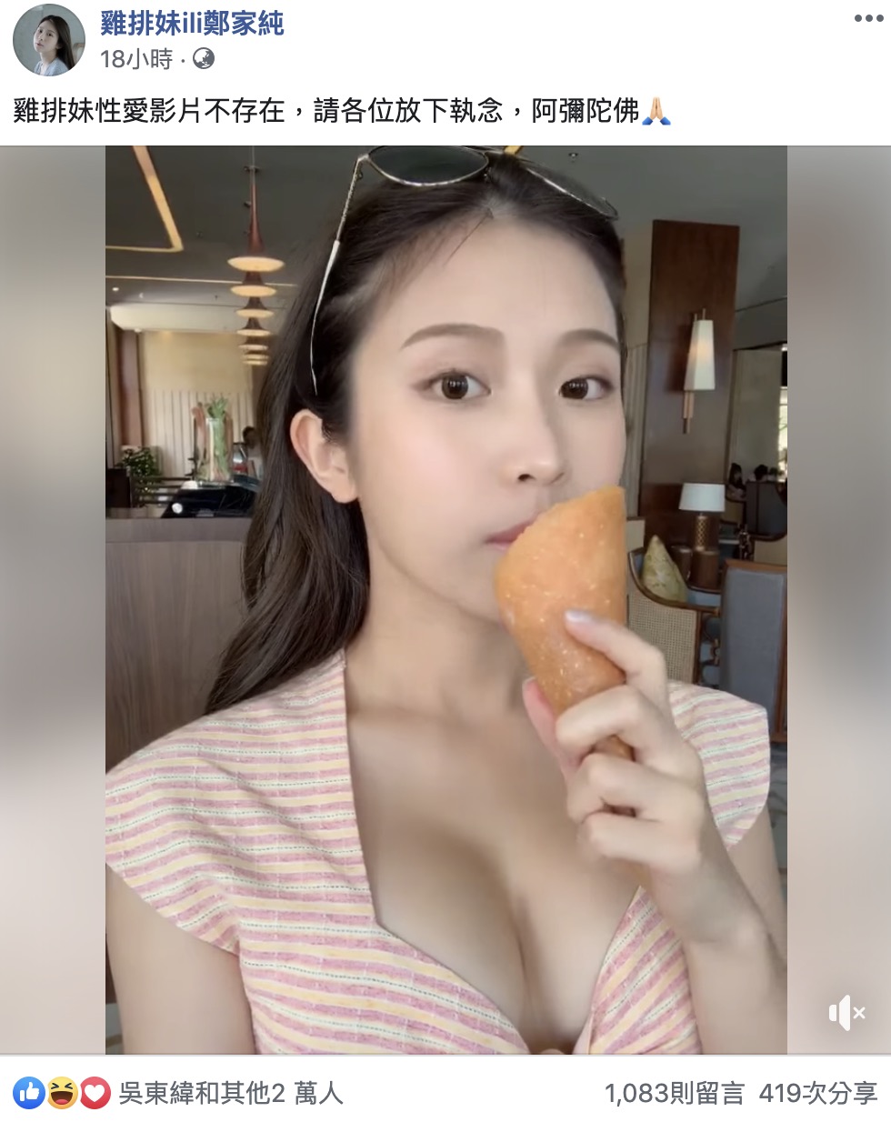 雞排妹過去也曾屢屢被網路上傳出有不雅影片外流,而在今年過年期間雞排妹又再度被瘋傳有不雅的影片流出,成為年假期間熱門的關鍵字,對此雞排妹也在臉書上發出一段10秒的影片,畫面中她穿著一件條紋的上衣,胸下有個結綁著支撐,渾圓豐滿的半球相當顯眼,雞排妹的手裡拿了一個冰淇淋甜筒,在片中她更是直接開始舔起冰淇淋,更發文寫下:「雞排妹性愛影片不存在,請各位放下執念,阿彌陀佛」。