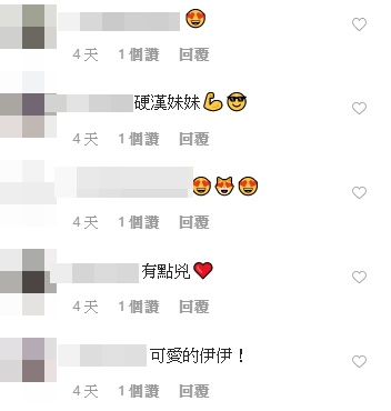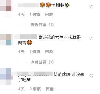 陳伊貼文一出,立刻有不少粉絲按讚,同時留言表示,「這泳衣可以!」、「辣翻啦~」、「會游泳的女生本來就很厲害」、「泳衣有扳回一城」、「真的是很賣力的游」、「游泳有開班授課嗎?」、「有點兇❤️」、「很胸很胸」。