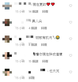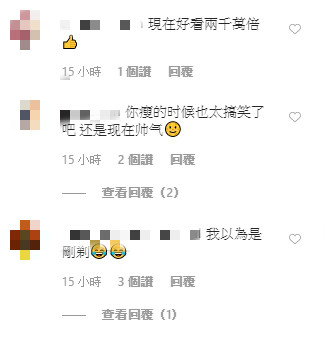 網友紛紛湧入貼文留言,表示「23那時候更瘦」、「七桃櫻那」「天哪太瘦了吧」、「好瘦…哇嗚、那現在是…發生什麼事」、「胡椒有肌肉ㄟ」、「也太兇」,也有粉絲指出「現在好看兩千萬倍」、「你瘦的時候也太搞笑了吧,還是現在帥氣」、「怎麼有人胖比較帥啊」、「現在更帥」,還有網友調侃他「出家?」、「更生人」、「好更生……」。