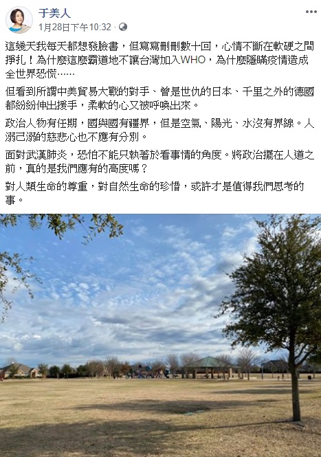 于美人在得知「禁止出口口罩事件」之後,也在自己的社群平台上發文表示,「這幾天我每天都想發臉書,但寫寫刪刪數十回,心情不斷在軟硬之間掙扎!為什麼這麼霸道地不讓台灣加入WHO,為什麼隱瞞疫情造成全世界恐慌...政治人物有任期,國與國有疆界,但是空氣、陽光、水沒有界線。人溺己溺的慈悲心也不應有分別,面對武漢肺炎,恐怕不能只執著於看事情的角度。將政治擺在人道之前,真的是我們應有的高度嗎?」