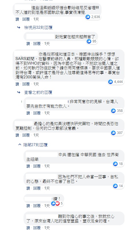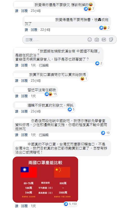 其他網友看完都紛紛留言表示,「我覺得妳還是不要發文!應該刪掉的」、「習近平沒有任期哦」、「你噁的程度真不輸中國兩姐妹花」、「中國真的不缺口罩,台灣反而還要仰賴進口,不是台灣冷血,我們目前真的自己都很難買到口罩了,怎麼有辦法出口或捐贈呢!」、「你的程度不輸范范耶!」、「中國缺的是良心!不是口罩!」、「中國真的真的不缺口罩!從中攔截物資的中共官員才是問題源頭」、「怎沒看您對香港警察迫害抗爭者呼籲尊重生命啊?」。