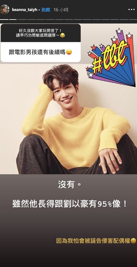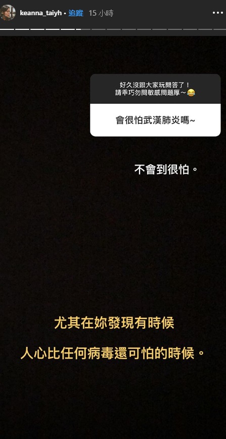 後來被網友問到跟那位可愛男孩有沒有什麼後續發展時,Keanna也逗趣的回說,「沒有~雖然他長得跟劉以豪有95%像,但我怕會被誣告侵害配偶權XD」而又被問到最近武漢肺炎相關的問題,「你會怕武漢肺炎嗎?」她則回說,「不會到很怕!尤其當你發現人心比任何病毒還可怕的時候」,讓人感受到她真的對於最近發生的事情感到徹底失望了!