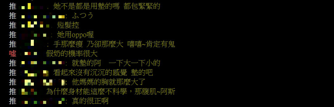 同時也有網友持不同意見,表示「開始健身之後奶變小了」、「狂健身所以杯杯縮小了吧」,更有網友表示「他媽媽的胸就那麼大了」,不太可能是造假,也有粉絲表示「蠻正的阿」、「正,腹肌推」、「很漂亮啊」、「隊長必推」、「還是覺得蠻漂亮的」