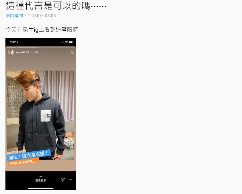 日前孫生在限時動態中貼出一張照片,只見他穿一件某牌的黑色帽T,並且標記一間賣家的帳號,沒想到卻因這張照片,被指出代言假貨!有網友在Dcard發文表示,覺得孫生照片中牌子的LOGO有點奇怪,放大仔細查看後,真的和正版不太一樣,同時原PO也發現,該賣場的東西似乎在淘寶上也能找到。