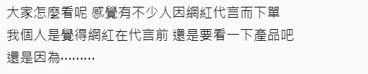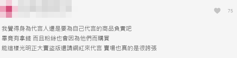 原PO將該賣場與淘寶的比對照片做出整理,通通上傳至文章內,藉此提醒網友別受騙,同時在文末寫下,「感覺有不少人因為網紅代言而下單,我個人是覺得網紅在代言前還是要看一下產品吧!」Dcard文章一出,立刻引起廣大網友討論,有人認為代言是自由,且代言假貨或是翻玩很好笑;不過多數人則認為,代言就必須對代言的商品負責,粉絲也會因網紅的影響力而購買商品,因此在選擇上應更加謹慎。