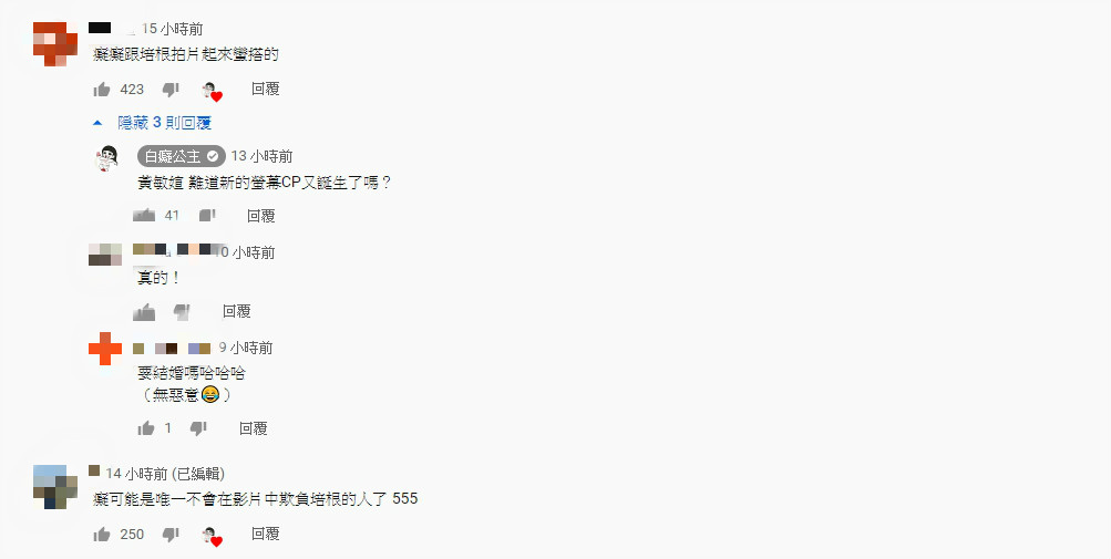 接著培根火力全開狂撩白癡公主,除了稱讚癡癡外貌「芙蓉出水」,還直言好像「找我的真命天女」,讓一向大膽的白癡公主害羞得說不出話來。影片一出引起網友熱烈討論,湧入影片底下留言,紛紛將兩人湊成一對:「這組合實在很配欸,無違和」、「癡癡跟培根拍片起來蠻搭的」、「癡可能是唯一不會在影片中欺負培根的人了,555」、「恭喜癡癡找到真命天子」,更有網友大力調侃白癡公主,驚呼「癡癡的變態功力竟然敗於培根淫威之下」,獲得不少網友按讚認同。