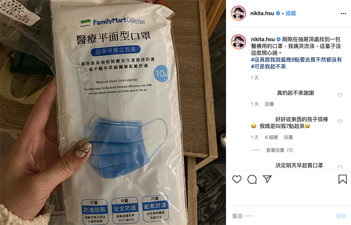 隨著武漢肺炎的疫情越來越嚴重,不管是台灣還是國外,都紛紛掀起了一股搶購口罩的風潮,而政府也推出了口罩限購的政策,讓大家都可以買到口罩,還把口罩從一片8元降到了一片6元,讓大家知道口罩真的是夠用,並不需要卯起來囤貨!可是還是有很多人跑了好多地方,依然買不到口罩,只能每天苦命尋找~而藝人舒子晨(Nikita)最近也在IG發文透露,自己也是買不到口罩,但是卻在家中的抽屜翻到某個東西,讓她差點痛哭出來!