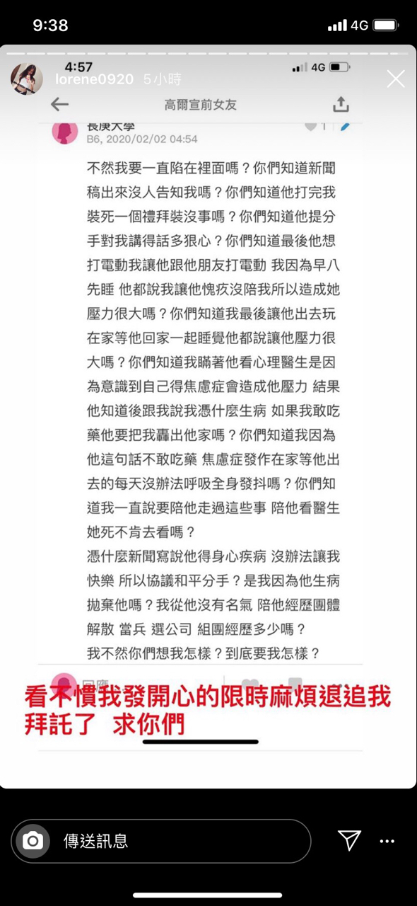前女友在最後更寫下:「憑什麼新聞寫說他得身心疾病沒辦法讓我快樂,所以協議和平分手?是我因為他生病拋棄他嗎?我從他沒有名氣陪他經歷團體解散、當兵、選公司、組團經歷多少嗎?不然你們想要我怎樣?到底要我怎樣?」,對於前女友的陳述目前高爾宣尚未有回應。