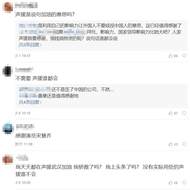 隨後,劉亞仁在演藝圈的好友宋慧喬,也轉發了同一張圖片,聲援武漢疫情:「Love for Wuhan,love for human」,成為微博熱搜,沒想到卻意外引來罵聲,被許多網友嘲諷「沒有實際作為」。網友們更質疑為什麼宋慧喬可以上熱搜,紛紛留言「聲援是說句加油的意思嗎?」、「我天天都在聲援武漢加油,我驕傲了嗎?我上頭條了嗎?沒有實際用處的聲援誰不會」、「還不是簽了中國的公司,不然…」、「聲援,屁用」、「簽了中國的經紀公司,在韓國口碑崩塌了,賺不了錢了,所以準備來中國圈錢,先刷美譽度」