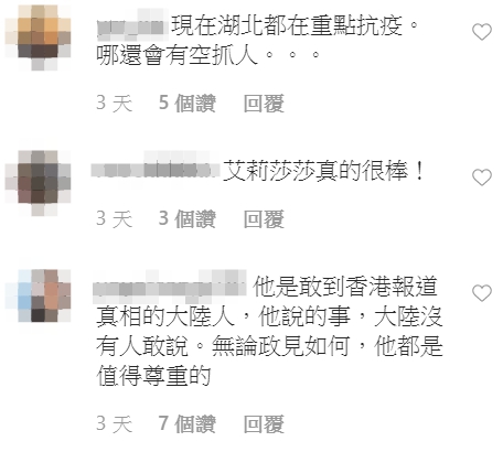 愛莉莎莎同時表示,她認為雖然陳秋實的影片中仍舊有一些疑點值得觀望,但是真實性相當高,勇闖一線的精神也令人十分敬佩,呼籲網友不要為別人「扣帽子」,輕易冠上假設的罪名,「例如:『支持統一』=『維穩工具』=『假新聞』」,而是親自去看看影片再來判斷價值。貼文一出便引發網友兩極看法,有許多網友紛紛同意表示「他拍的真的不錯!!! 感覺也有真實性,最近他25分鐘的視頻,最後說 『前有病毒,後有共產黨。』 他壓力真的很大。」、「我也都是看他的影片。我覺得他不怕惹事,他有說隨時可能被抓。」、「終於看到理智的youtuber了。」
