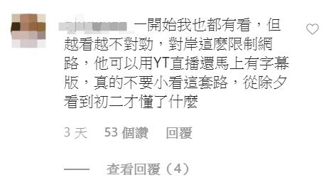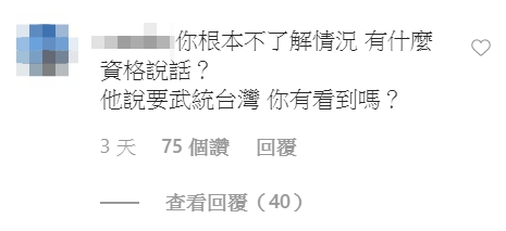 但也有網友提出完全相反的觀點,表示「你根本不了解情況,有什麼資格說話?他說要武統台灣,你有看到嗎?」、「新的一年祝您長智慧,不要只看表面」、「一開始我也都有看,但越看越不對勁,對岸這麽限制網路,他可以用YT直播還馬上有字幕版,真的不要小看這套路」。