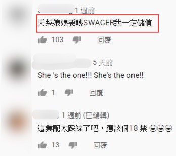 影片開頭天菜小姐以一身粉紅緊身衣入鏡,上半身胸圍位置呈現鏤空的設計,讓她渾圓的北半球一覽無遺,好身材直讓人流鼻血,下半身以超短百褶裙做搭配,火辣身材一點也不輸給旁邊Swagger,天菜小姐讓四位YouTuber體驗真實版Swagger上演的第一反應,第一位挑戰者MOMO在一旁更是臉紅心跳的直呼:「這是X片嗎?」。