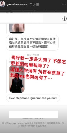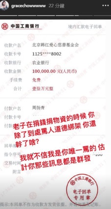 對於突如其來的批評訊息,周揚青看了也非常生氣,她將對話內容截圖之後公開PO在限時動態並寫著,「媽呀!我一定是太閒,不然怎麼開始曬智障?這種人微博、抖音上有就算了,怎麼連Ins也開始有了?」並在下個限時動態中PO出自己捐助「10萬人民幣」的收據回嗆網友們說,「老子捐錢捐物資時,你除了罵人、道德綁架,還幹了啥?」並提到,她不相信這位網友只有罵她,這種訊息一定是群發的!