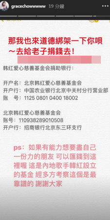 最後周揚青也在發文中直接Tag那位罵她的網友,留下了捐款的詳細資料並表示,「我也來道德綁架你一下~去給老子捐錢去!」並且接著說,「有能力想要盡自己一份力的朋友,可以匯錢到這裡哦!這是韓紅設立的基金,這是最靠譜的,謝謝大家!」讓那些批評她的網友們瞬間閉嘴,不能再繼續攻擊她!