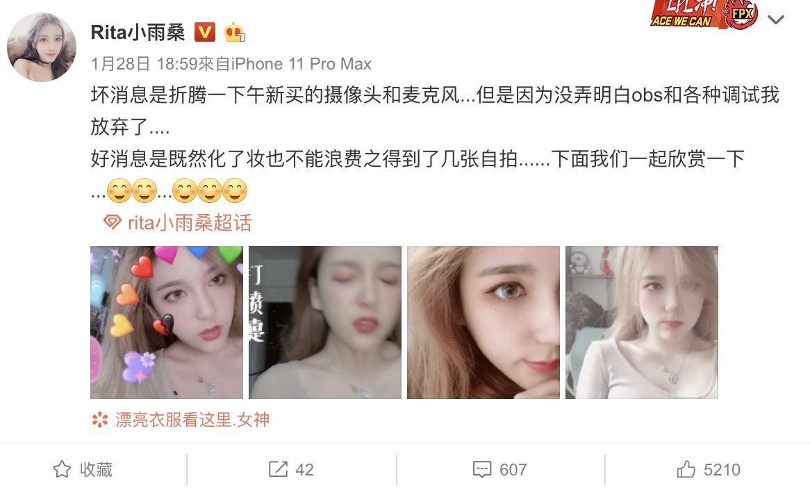 現今各種直播平台層出不窮,許多素人都在直播時展現出自己的才華,或是因為擁有亮麗的外表,以及姣好的身材而獲得許多粉絲的支持,進而成為網路紅人,現今在大陸電競產業相當發達,有一名專門解說英雄聯盟(LOL)的直播主「Rita小雨桑」人氣非常的旺,她曾被官方找來當主持人和解說員,超高顏值引起熱烈討論,而在一月底時Rita曬出系列自拍美照,當中有一張照片神情相當迷濛,曝光後也立刻引起網友熱烈討論。