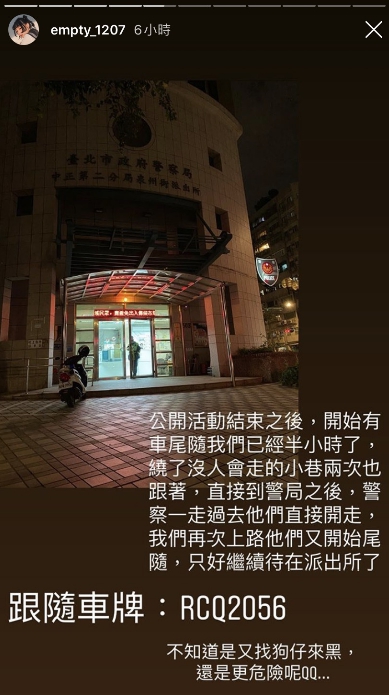 日前本本更新限時動態表示,在公開活動結束之後,發現遭到車子尾隨,即使繞進小路對方也持續跟著,直到洛克、本本進警局,對方看到警察出面,才立刻開走。沒想到的事,當本本再次上路時,發現對方又繼續跟車,讓她最後只能繼續待在派出所。而本本也在限時動態中公布車牌,擔心寫下「不知道是又找狗仔來黑,還是更危險呢QQ」令不少網友感到擔心。
