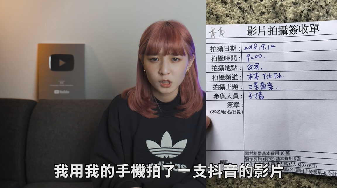 被跟蹤的同一天,本本也於頻道上傳新影片,其中提出前公司積欠薪水一年的問題,並且提到當公司得知本本要解約時,突然冒出「影片拍攝簽收單」要她簽名。對此,本本解釋自己只是用手機拍攝抖音短片,簽收單上卻出現「器材租借基本費用10萬」等,讓本本十分質疑表示,「根本沒有這些開銷,你要我怎麼簽?想請問一下,這些單子是要我簽來給你們作帳用的嗎?」。