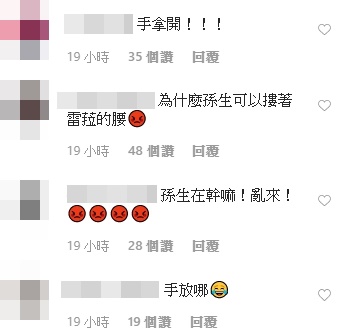 網友們除了瘋猜兩人「案情不單純」以外,也開始紛紛忌妒起孫生,許多人留言表示,「手拿開!」、「為什麼孫生可以摟著蕾菈的腰」、「孫生在幹嘛!亂來」、「手很不安分」、「放開那女孩」、「砍掉孫生的手!」、「那個手給我注意一點」、「孫生會成為男性公敵,手給我放開」。