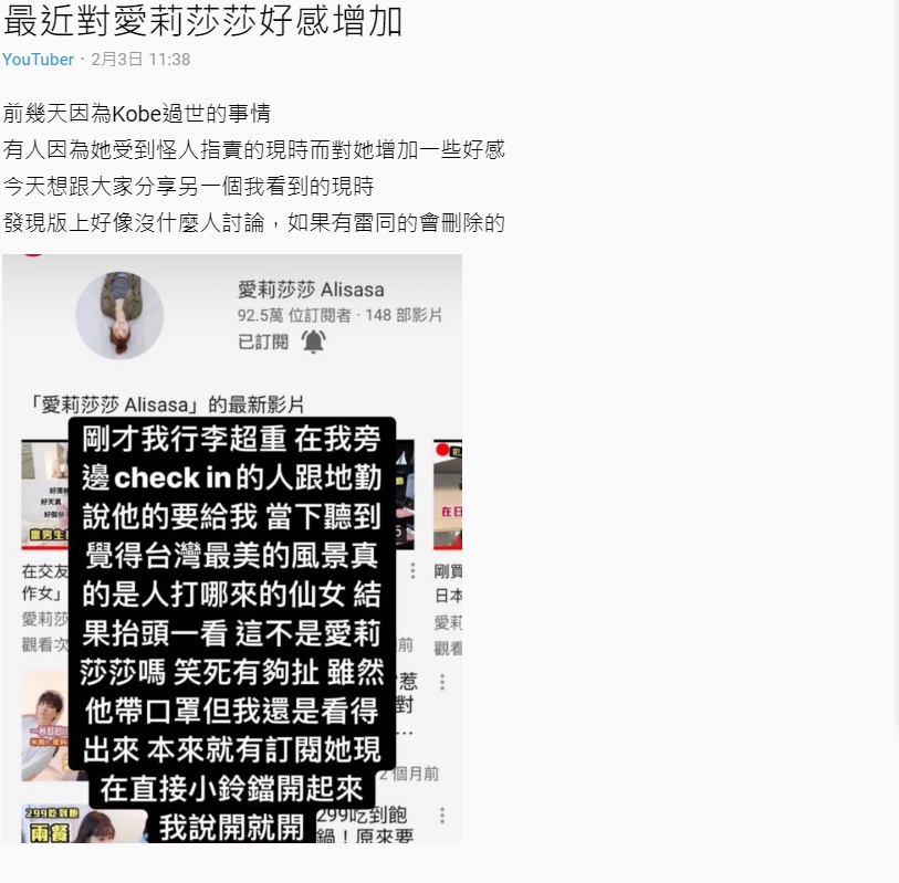 日前有人在Dcard發文提到,前陣子球星Kobe過世時,愛莉莎莎的一番話,讓她增加一些好感,隨後又看到一名網友的限時動態,讓原PO決定分享給大家!從截圖中可以看到,一名網友在自己的限時動態表示,自己的行李超重,旁邊Check in的人竟直接跟地勤說要將公斤數讓出,正想看看是哪位仙女時,發現那人竟是「愛莉莎莎」,巧遇網紅還被溫暖救援,讓該網友直呼「本來就有訂閱,現在直接小鈴鐺開起來,我說開就開!」。