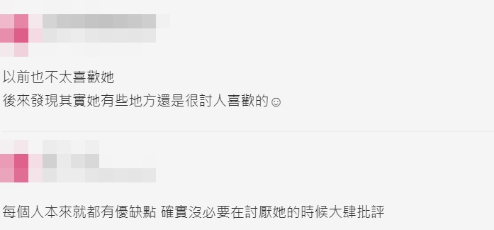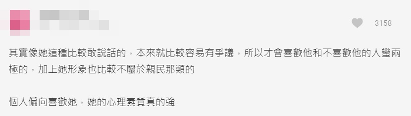 Dcard文章一發出,立刻引來不少人關注此事,大家紛紛留言表示,「個人偏向喜歡她,她的心理素質真的強」、「以前也不太喜歡她,後來發現其實她有些地方還是很討人喜歡的」、「喜歡愛莉莎莎+1,覺得他講話很直接態度很真」、「我很佩服她心理素質很強!現在不管別人怎麼說討厭她,我都還是挺喜歡她的」。