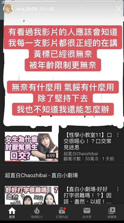 隨後,超直白再度更新一則限時動態,為自己打抱不平表示,「看過我影片的人應該會知道,我每一支影片都很正經的在講!」對於黃標感到無奈,被年齡限制更是無奈!不過她也為自己加油打氣,認為無奈、氣餒也沒有用,只能繼續堅持下去。