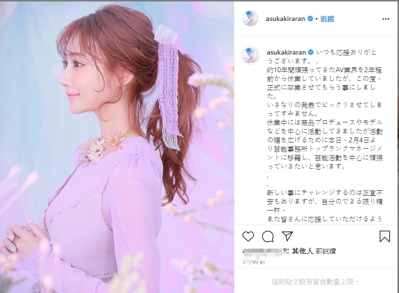 明日花綺羅在前年9月,正式宣布退役後,讓許多粉絲都十分失望。去年底時,又被粉絲發現,她早期的作品皆連被下架,讓一票網友相當緊張,認為她復出的機會越來越小。今天,她也透過IG正式宣布,自己從「成人界中正式畢業」!