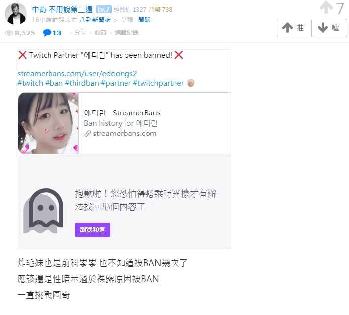 有網友在「遊戲大亂鬪」中分享,「에디린」這幾天遭到Ban台,同時該網友也在文章中提到,實況主前科累累,一直在挑戰圖奇,這次應該也是因為性暗示過於裸露而被禁權。Ban台消息一出,立刻引來不少人討論此事,同時也有網友曬出近日的備份影片,只見「에디린」穿著超短熱褲趴在地上,時不時扭腰擺臀,令人血脈噴張,不過其他人看完影片則認為,這段並沒有性暗示畫面,實際被停權原因仍不得而知。